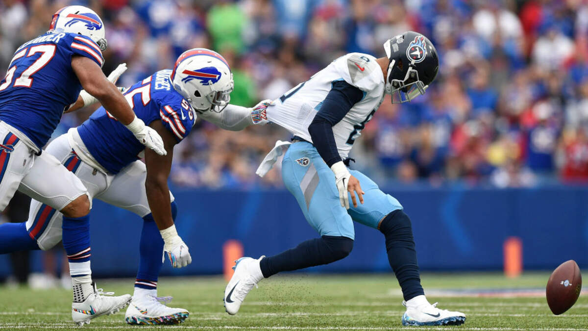 BUFFALO, NY - OCTOBER 07: Quarterback Marcus Mariota #8 of the Tennessee Titans fumbles the ball as he is sacked by defensive end Jerry Hughes #55 of the Buffalo Bills in the fourth quarter at New Era Field on October 7, 2018 in Buffalo, New York. (Photo by Patrick McDermott/Getty Images)